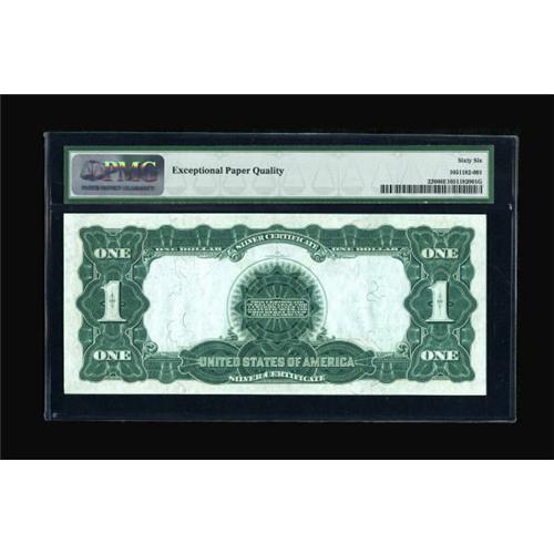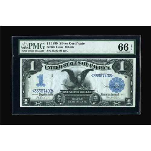 <B>Fr. 226 $1 1899 Silver Certificate PMG Gem Uncirculated 66 EPQ.</B></I> The first of the Black Eagle Aces and an unusually nice example with ideal colors, broad even margins, plainly evident paper originality, and loads of eye appeal. This first number of 1899 Ones is a minor one-number type with the "Series of 1899" appearing above the right-hand serial number. <BR><BR><b>Shipping:</b> Coins & Currency (<a target="_blank" href="http://www.heritageauctions.com/common/shipping.php">view shipping information</a>)