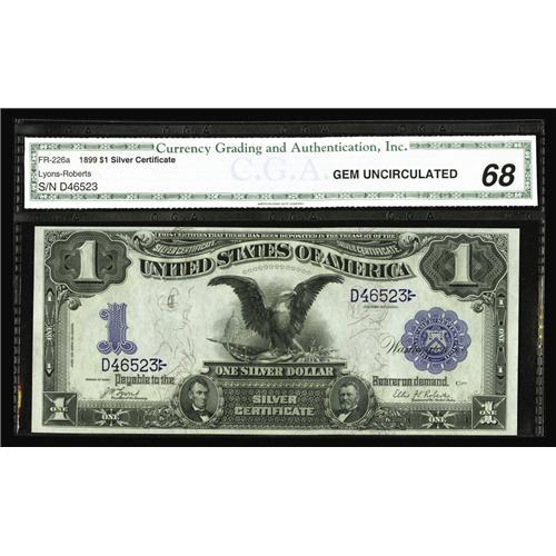 <B>Fr. 226a $1 1899 Silver Certificate CGA Gem Uncirculated 68.</B></I> The original embossing is easy to see on this stunning First Black Eagle number. The margins are huge, and the colors of the paper and inks are perfect.