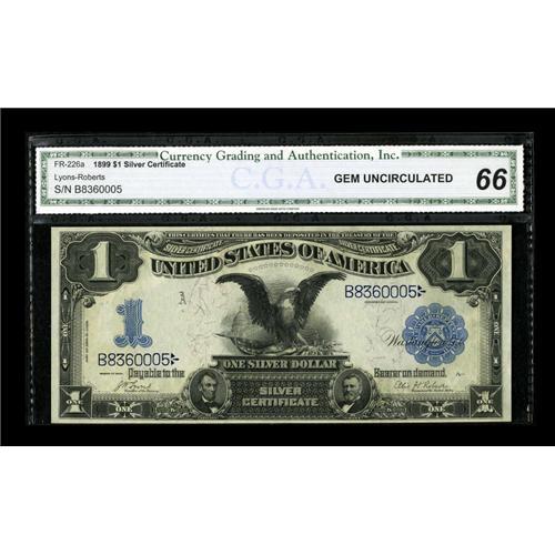 <B>Fr. 226a $1 1899 Silver Certificate CGA Gem Uncirculated 66.</B></I> Nicely margined, with obviously deep, original embossing.<BR><BR><b>Shipping:</b> Coins & Currency (<a target="_blank" href="http://www.heritageauctions.com/common/shipping.php">view shipping information</a>)