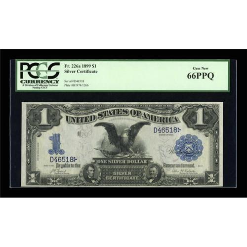 <B>Fr. 226a $1 1899 Silver Certificate PCGS Gem New 66PPQ.</B></I> Just a hair less perfectly centered than the PCGS 67PPQ example above, and consecutive to it. It's fully embossed and screamingly original, as are all four pieces from this cut sheet.<BR><BR><b>Shipping:</b> Coins & Currency (<a target="_blank" href="http://www.heritageauctions.com/common/shipping.php">view shipping information</a>)