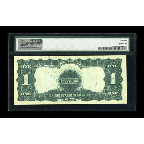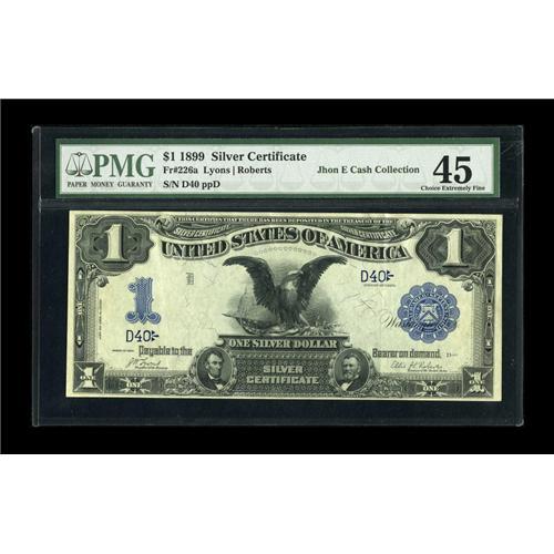 <B>Fr. 226a $1 1899 Silver Certificate PMG Choice Extremely Fine 45.</B></I> This Black Eagle is adorned with low serial number D40. It has three light folds and original paper surfaces. Don't start singing the <I>Folsom Prison Blues</B></I> if you miss out on this note formerly of the Jhon E. Cash Collection.<BR><BR><b>Shipping:</b> Coins & Currency (<a target="_blank" href="http://www.heritageauctions.com/common/shipping.php">view shipping information</a>)