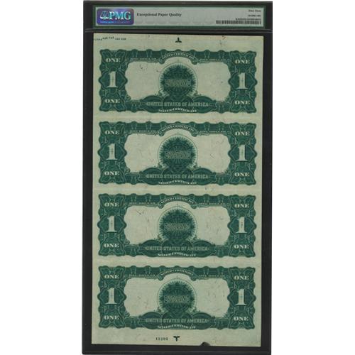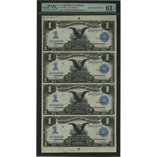 <B>Fr. 226a $1 1899 Silver Certificates Uncut Sheet of Four PMG Choice Uncirculated 63 EPQ.</B></I> All uncut sheets of large size U.S. type notes are quite rare. This Black Eagle sheet is actually one of the more common with around a dozen examples known. The sheet is clean and bright, but there is a fold between each note, and a partial workman's fingerprint is at the bottom edge. With the current popularity of the Black Eagle type combined with the overall rarity of uncut sheets, we would not be surprised to see this sheet reach or exceed ...<BR><BR><b>Shipping:</b> Coins & Currency (<a target="_blank" href="http://www.heritageauctions.com/common/shipping.php">view shipping information</a>)