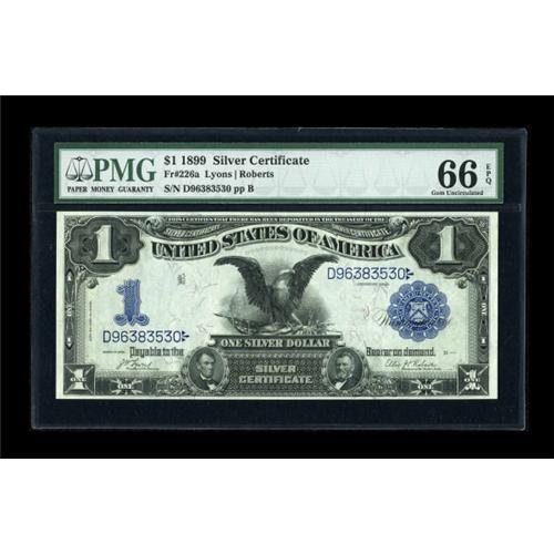 <B>Fr. 226a $1 1899 Silver Certificate PMG Gem Uncirculated 66 EPQ.</B></I> Breathtaking color coupled with wonderful original surfaces are features of a Black Eagle certain to please its new owner.<BR><BR><b>Shipping:</b> Coins & Currency (<a target="_blank" href="http://www.heritageauctions.com/common/shipping.php">view shipping information</a>)