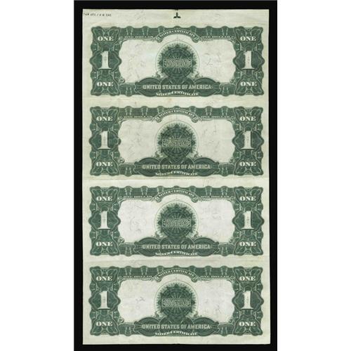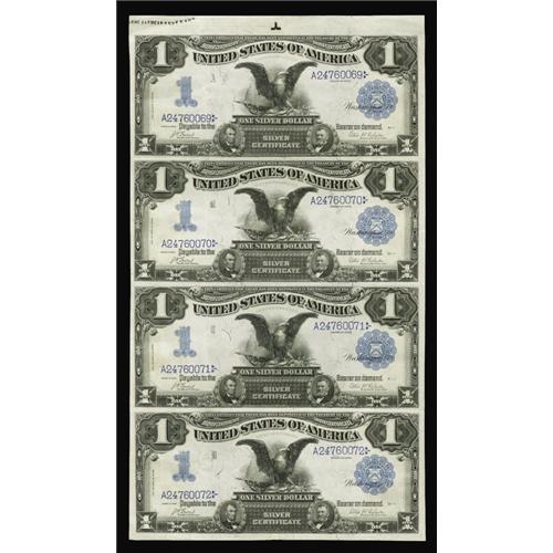 <B>Fr. 226a $1 1899 Silver Certificate Uncut Sheet Extremely Fine.</B></I> A bright, colorful, uncut sheet of Black Eagles. Fr. 226a is the most "common" uncut sheet of Large Size Type Notes, with a dozen sheets now known. This sheet was mailed in Washington D.C. in 1904 by a Mr. Amos Luke to his daughter, Cora M. Luke. The letter, and presumably the sheet (which is folded between subjects) was sent in a U.S. Senate envelope, although Amos Luke was never a U.S. Senator. The relevant passage in the letter: "I also send herewith several souvenirs of money that I have had for a long time and fear I may lose them. They are scarce, and you will do well to keep them[,] then you will always have money. The four dollars are just as they come from the printing office, and they cannot be had any more in this form. . . Keep it and if you get hard run for money clip off a dollar and spend it." Mr. Luke had just returned to Washington from a trip to New England, and the remainder of the letter waxes poetic about New England in the early fall. The sheet itself is beautifully bright, with a fold between each note and two vertical folds down the sheet. <BR><BR><B>Important notice:</B> Heritage usually auctions material at the rate of 200-250 lots per hour. On some occasions eBay Live bid software or the Internet may not be able to keep up with the pace of the auction. We recommend placing a realistic absentee bid now as insurance to avoid disappointment. Occasionally the auctioneer may eliminate or reject an eBay Live bid, and the auctioneer may also reopen a lot after the close of the eBay live bidding (usually because we missed an audience bid), and may reject your bid even if it shows you as the winning bidder. By bidding via eBay Live, you agree that Heritage may award the lot to another bidder at its sole discretion under the circumstances described above or any other reasonable circumstances. Since eBay bids are not shown to us until we open the lot on the floor, we treat those bids just like floor bids. In most cases the floor responds before the eBay bid is presented to us, due to Internet lag time, so for consistency we have made it a policy that floor bids are always considered first over tie eBay live bids. Also please note that all Heritage lots purchased through eBay Live carry a 20% Buyer's Premium. Please make sure you read the Terms and Conditions before you bid. This lot is being auctioned in conjunction with a live floor auction by Heritage Galleries & Auctioneers. All final auction and invoice information will be supplied by Heritage Galleries & Auctioneers, and all other information should be considered preliminary. Lot:17011 <BR><BR><B>Winning Notification and Billing:</B> After the FINAL session in this auction is complete, Heritage will send e-mail and snail mail invoices. This process normally takes several days. All final auction and invoice information will be supplied by Heritage Galleries & Auctioneers, and all other information should be considered preliminary. <BR><BR>This auction will be conducted on a live auction floor and over the Internet through eBay Live. If you choose to place an absentee bid, please take a moment to <font color='#0000ff'><u><a href='http://pages.ebay.com/liveauctions/help/before/laabsentee.html'>learn how eBay Live absentee bidding works</a></u></font><font color='#000000'>
