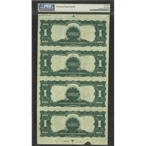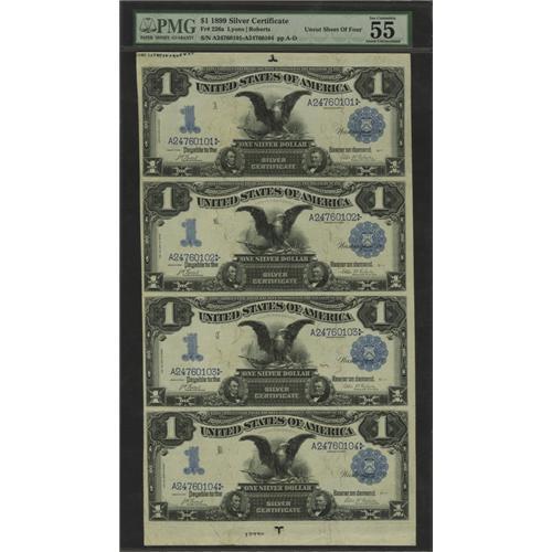 <B>Fr. 226a $1 1899 Silver Certificate Uncut Sheet of Four PMG About Uncirculated 55 EPQ.</B></I> This is a perfectly original, problem-free uncut sheet with folds between the notes and one fold in the top margin selvage and another fold in the bottom margin selvage. The face plate number is 12776 and the back plate number is 13192. Workmen initials have been added near the top edge on both sides. This was a practice that was carried over from postage stamp production and was done only during the first decade of the Twentieth Century. One workman has also left behind a fingerprint along the back bottom edge. There are a dozen uncut sheets of this Friedberg number in the census including this sheet. This example has crossed the auction block only twice before in the last thirty years.<BR><BR><b>Shipping:</b> Coins & Currency (<a target="_blank" href="http://www.heritageauctions.com/common/shipping.php">view shipping information</a>)