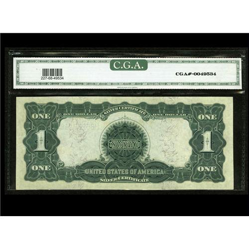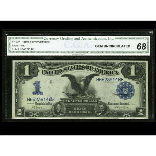 <B>Fr. 227 $1 1899 Silver Certificate CGA Gem Uncirculated 68.</B></I> Fr. 227 is the second scarcest of the Black Eagle numbers. It is actually slightly scarcer than the much more highly touted Fr. 231. Only Fr. 229a is represented by fewer known examples than Fr. 227. This piece is beautifully margined, with excellent paper originality that remains easy to see in spite of its encapsulation.