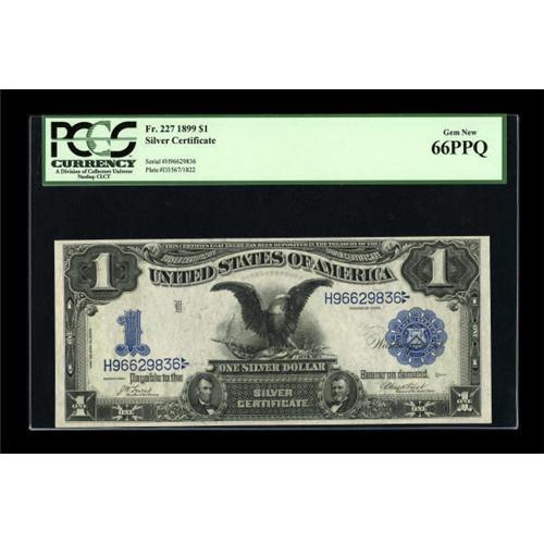 <B>Fr. 227 $1 1899 Silver Certificate PCGS Gem New 66PPQ.</B></I> Fresh paper waves and broad margins give this scarcer Friedberg number all the eye appeal of a Superb Gem.<BR><BR><b>Shipping:</b> Coins & Currency (<a target="_blank" href="http://www.heritageauctions.com/common/shipping.php">view shipping information</a>)