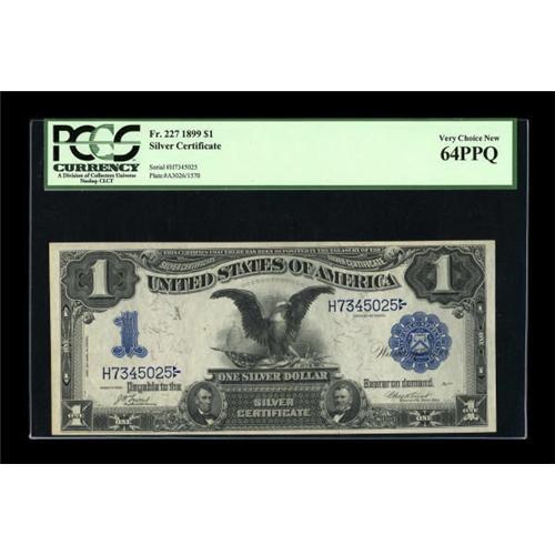 <B>Fr. 227 $1 1899 Silver Certificate PCGS Very Choice New 64PPQ.</B></I> Deep blue serial numbers and seal are boldly embossed on this wavy and original near-Gem.<BR><BR><b>Shipping:</b> Coins & Currency (<a target="_blank" href="http://www.heritageauctions.com/common/shipping.php">view shipping information</a>)