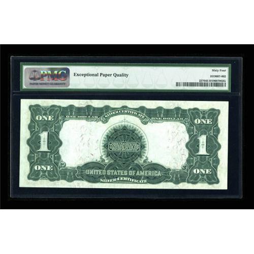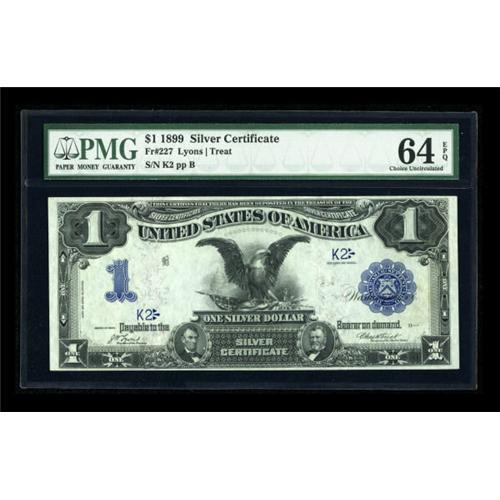 <B>Fr. 227 $1 1899 Silver Certificate PMG Choice Uncirculated 64 EPQ.</B></I> A serial number 2 example with terrific color, and good, original embossing. Fr. 227 is a much scarcer Black Eagle Friedberg number--particularly in the higher grades. Single-digit examples have been commanding very strong prices and this strikingly attractive piece should create considerable interest. <BR><BR><b>Shipping:</b> Coins & Currency (<a target="_blank" href="http://www.heritageauctions.com/common/shipping.php">view shipping information</a>)