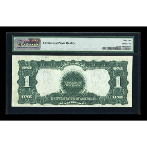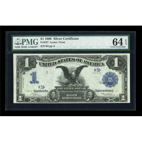 <B>Fr. 227 $1 1899 Silver Certificate PMG Choice Uncirculated 64 EPQ.</B></I> We first handled this piece in our 2006 September Long Beach Auction where it realized more than $4,000. At the time, it was graded by PCGS Very Choice New 64PPQ. Its appearance included the following description, "Fr. 227 is one of the more elusive Black Eagle numbers, challenging to obtain in Gem grade. This near Gem is a real beauty, with broad margins and plainly evident, deep original embossing. Also the single digit serial number of K5 gives the note stupefying eye appeal. Fifteen years have passed since the whereabouts of this piece were known."<BR><BR><b>Shipping:</b> Coins & Currency (<a target="_blank" href="http://www.heritageauctions.com/common/shipping.php">view shipping information</a>)