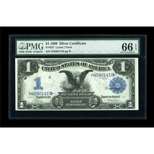 <B>Fr. 227 $1 1899 Silver Certificate PMG Gem Uncirculated 66 EPQ.</B></I> An example worthy of your consideration as the surfaces are near perfect.<BR><BR><b>Shipping:</b> Coins & Currency (<a target="_blank" href="http://www.heritageauctions.com/common/shipping.php">view shipping information</a>)