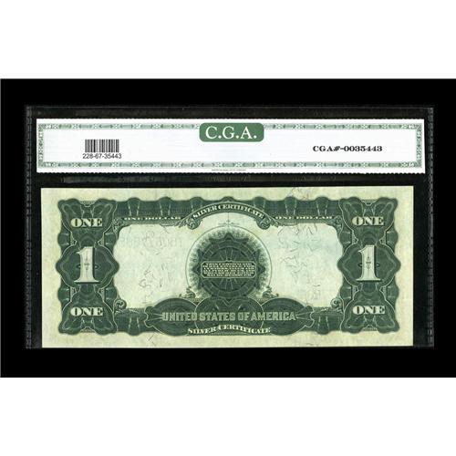 <B>Fr. 228 $1 1899 Silver Certificate CGA Gem Uncirculated 67.</B></I> Hugely margined and with original embossing that is easy to see through the third-party holder. Clearly a very nice note that certainly appears to earn - if not surpass - the 67 grade. Fr. 228 is not normally seen in the high grades associated with 226, 233 and 236.
