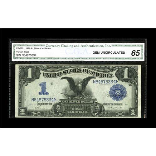 <B>Fr. 228 $1 1899 Silver Certificate CGA Gem Uncirculated 65.</B></I> Hugely margined with clearly original embossing that can be seen through the third-party holder. The "65" grade appears to be conservative to us.