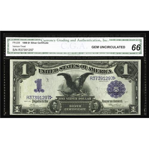 <B>Fr. 228 $1 1899 Silver Certificate CGA Gem Uncirculated 66.</B></I> This Vernon-Treat Black Eagle is from the "A" position.