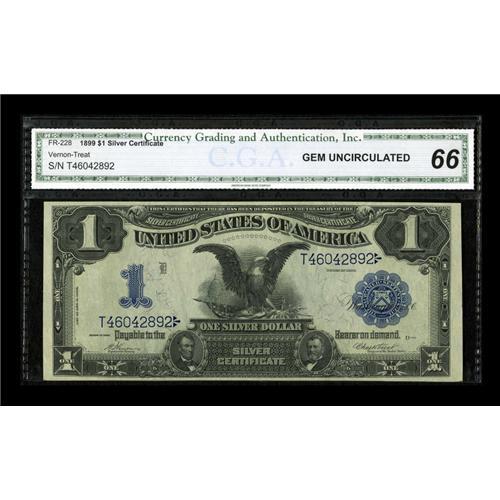 <B>Fr. 228 $1 1899 Silver Certificate CGA Gem Uncirculated 66.</B></I> Bold embossing is noted on this evenly margined Gem.<BR><BR><b>Shipping:</b> Coins & Currency (<a target="_blank" href="http://www.heritageauctions.com/common/shipping.php">view shipping information</a>)