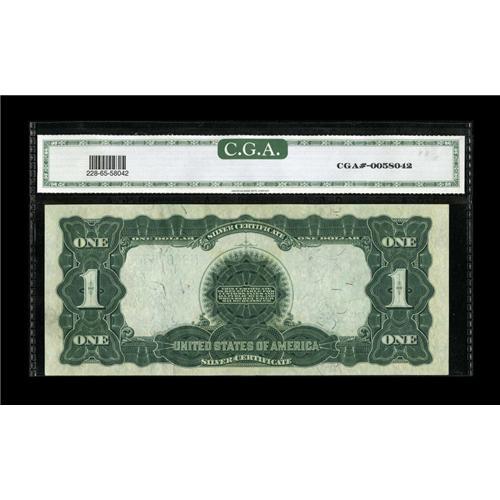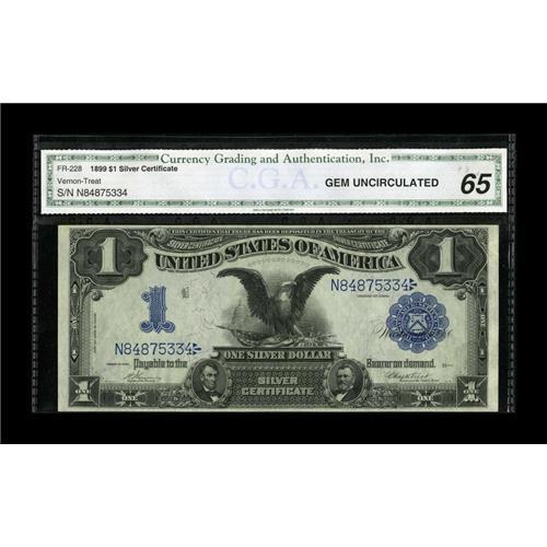 <B>Fr. 228 $1 1899 Silver Certificate CGA Gem Uncirculated 65.</B></I> Hugely margined with clearly original embossing that can be seen through the third party holder. The "65" grade appears to be conservative to us.<BR><I>From The Collection of Greg Southward</B></I><BR><BR><b>Shipping:</b> Coins & Currency (<a target="_blank" href="http://www.heritageauctions.com/common/shipping.php">view shipping information</a>)