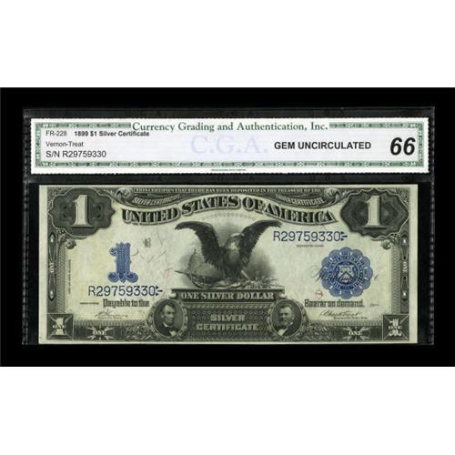 <B>Fr. 228 $1 1899 Silver Certificate CGA Gem Uncirculated 66.</B></I> A pleasing Black Eagle that has thick side margins.<BR><BR><b>Shipping:</b> Coins & Currency (<a target="_blank" href="http://www.heritageauctions.com/common/shipping.php">view shipping information</a>)