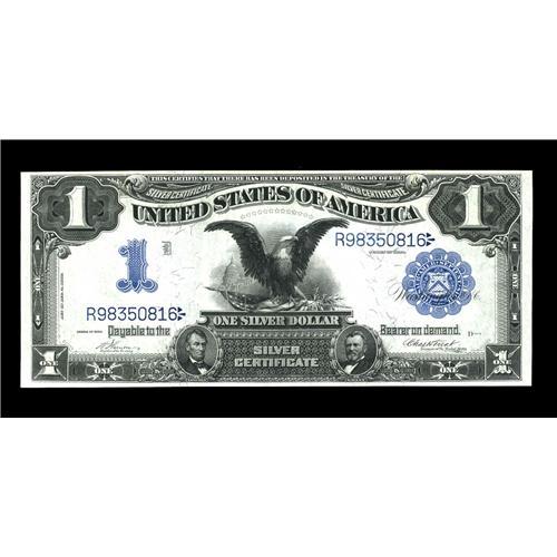 <B>Fr. 228 $1 1899 Silver Certificate New.</B></I> Here is another pleasing Black Eagle that is quite colorful yet somewhat flat probably from storage in a book. A small split was corrected in the upper margin.