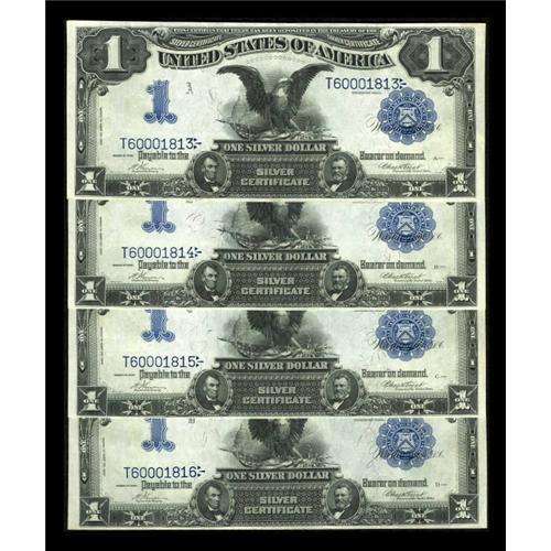 <B>An Original Cut Sheet. Fr. 228 $1 1899 Silver Certificate Notes Extremely Fine.</B></I> This attractive cut sheet shows original paper and deep embossing on each note. There are however, three folds on each piece accounting for the grade.<BR><BR><b>Shipping:</b> Coins & Currency (<a target="_blank" href="http://www.heritageauctions.com/common/shipping.php">view shipping information</a>)
