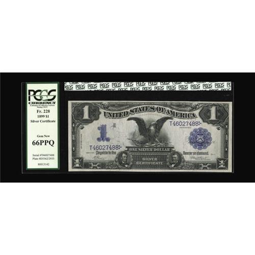 <B>Fr. 228 $1 1899 Silver Certificate PCGS Gem New 66PPQ.</B></I> This note pops with vivid colors and wonderful eye appeal. The centering is slightly high, but all in all this is an excellent type note.