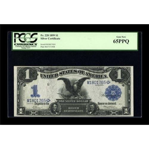 <B>Fr. 228 $1 1899 Silver Certificate PCGS Gem New 65PPQ.</B></I> Deep embossing of the seal and serial numbers is noted on back. The margins are sufficient for a Gem grade and frame the deeply printed devices.<B><BR></B></I><I>From The Walla Walla Collection</B></I><BR><BR><b>Shipping:</b> Coins & Currency (<a target="_blank" href="http://www.heritageauctions.com/common/shipping.php">view shipping information</a>)