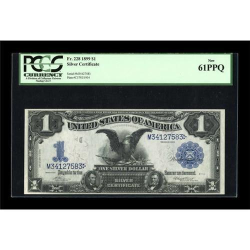 <B>Fr. 228 $1 1899 Silver Certificate PCGS New 61PPQ.</B></I> The grade limiting factor on this fully margined issue is not readily apparent.<BR><BR><b>Shipping:</b> Coins & Currency (<a target="_blank" href="http://www.heritageauctions.com/common/shipping.php">view shipping information</a>)