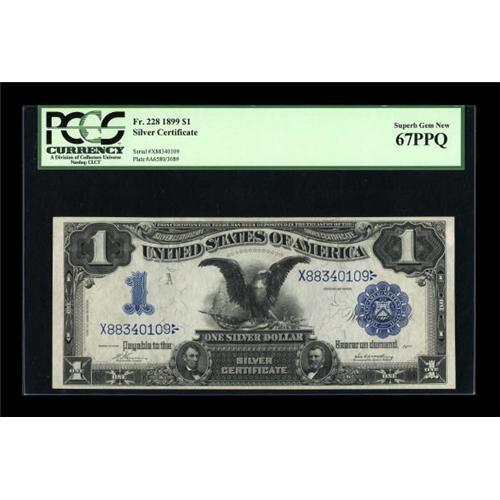 <B>Fr. 228 $1 1899 Silver Certificate PCGS Superb Gem New 67PPQ.</B></I> Incredible face margins, along with strong color, and readily apparent original embossing all combine on this Superb 1899 Ace. <BR><BR><b>Shipping:</b> Coins & Currency (<a target="_blank" href="http://www.heritageauctions.com/common/shipping.php">view shipping information</a>)