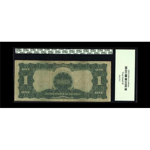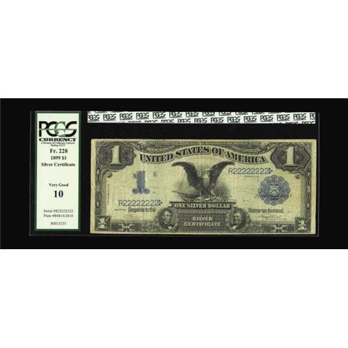 <B>Fr. 228 $1 1899 Silver Certificate PCGS Very Good 10.</B></I> Last appearing in a Lyn Knight sale over four years ago where it realized $2329, this solid serial Black Eagle is quite the conversation piece. Fancy numbers on large size notes have always been prohibitively scarce. This average circulated note remains bright despite some light soiling.
