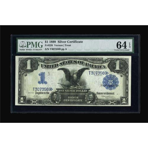 <B>Fr. 228 $1 1899 Silver Certificate PMG Choice Uncirculated 64 EPQ.</B></I> Strict originality is noticed on this nicely margined Black Eagle.<BR><BR><b>Shipping:</b> Coins & Currency (<a target="_blank" href="http://www.heritageauctions.com/common/shipping.php">view shipping information</a>)