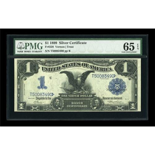<B>Fr. 228 $1 1899 Silver Certificate PMG Gem Uncirculated 65 EPQ.</B></I> A thin margin along the bottom of this original Black Eagle keeps it from a higher grade.<B><BR></B></I><I>From The John Ameen Collection</B></I><BR><BR><b>Shipping:</b> Coins & Currency (<a target="_blank" href="http://www.heritageauctions.com/common/shipping.php">view shipping information</a>)