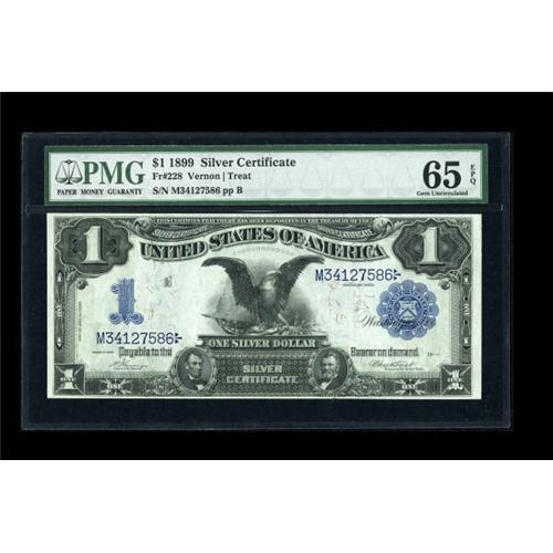 <B>Fr. 228 $1 1899 Silver Certificate PMG Gem Uncirculated 65 EPQ.</B></I> This gorgeous Black Eagle returns to the market after being in a long held collection.<BR><BR><b>Shipping:</b> Coins & Currency (<a target="_blank" href="http://www.heritageauctions.com/common/shipping.php">view shipping information</a>)