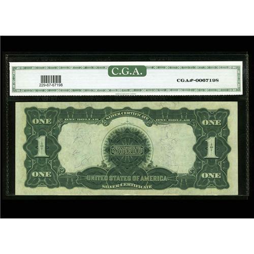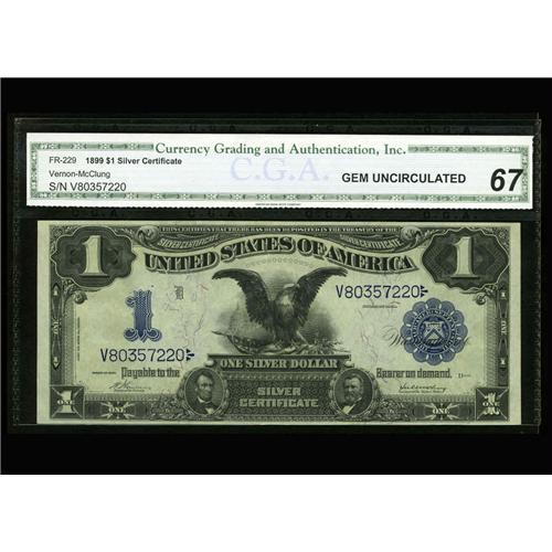 <B>Fr. 229 $1 1899 Silver Certificate CGA Gem Uncirculated 67.</B></I> Bold, original embossing is easily seen through the CGA holder on this handsome 1899 Ace.