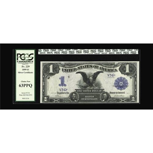 <B>Fr. 229 $1 1899 Silver Certificate PCGS Choice New 63PPQ.</B></I> A partial up ladder serial number is noticed on this bright example which last appeared for sale 3 years ago. With the demand ever increasing for these fancy serial number notes expect a realization in the area of...