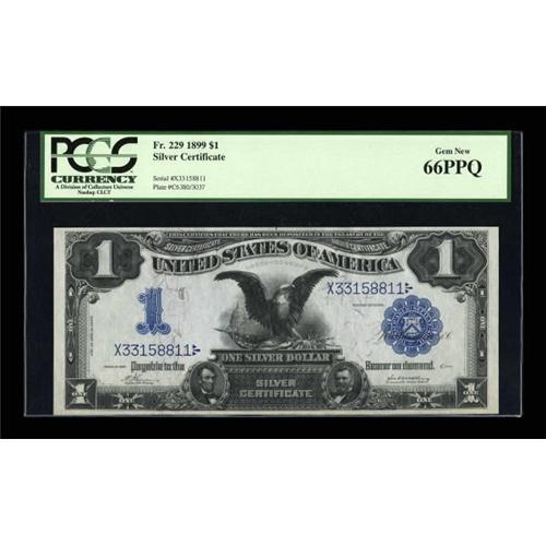 <B>Fr. 229 $1 1899 Silver Certificate PCGS Gem New 66PPQ.</B></I> Perfectly centered on both sides among outsized margins. The note boasts deep original embossing, sharp printing quality, and terrific eye appeal. <BR><BR><b>Shipping:</b> Coins & Currency (<a target="_blank" href="http://www.heritageauctions.com/common/shipping.php">view shipping information</a>)