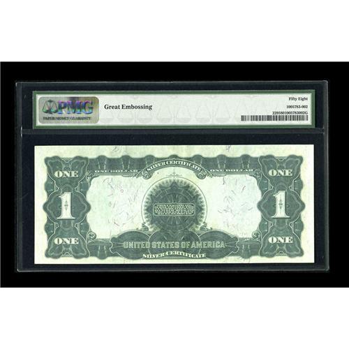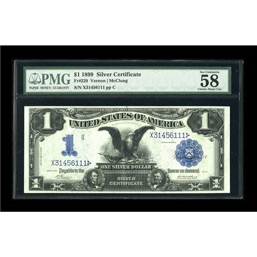 <B>Fr. 229 $1 1899 Silver Certificate PMG Choice About Unc 58.</B></I> A lovely AU Black Eagle, with huge margins and the PMG comment, "Great Embossing."