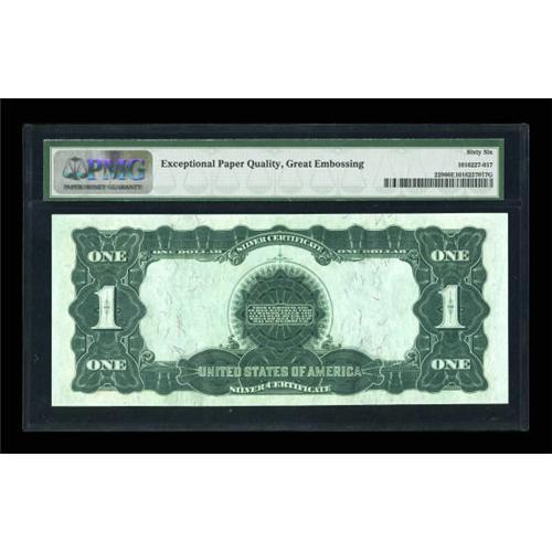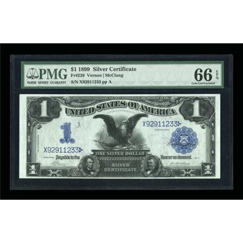 <B>Fr. 229 $1 1899 Silver Certificate PMG Gem Uncirculated 66 EPQ.</B></I> Broad margins are the mainstay of this eye appealing Black Eagle's good looks.<BR><BR><b>Shipping:</b> Coins & Currency (<a target="_blank" href="http://www.heritageauctions.com/common/shipping.php">view shipping information</a>)