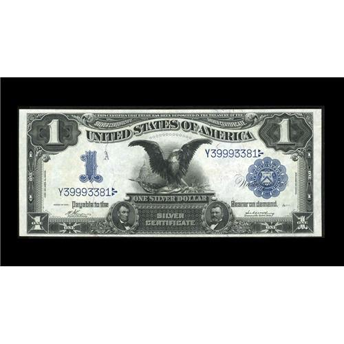 <B>Fr. 229a $1 1899 Silver Certificate Extremely Fine-About New.</B></I> By far the rarest of the Black Eagles, with only about fifty examples known in all grades combined. This piece is a beauty with nice paper surfaces, great color, and beautifully broad margins. Unless examined very closely, the note gives the appearance of a perfect Gem.