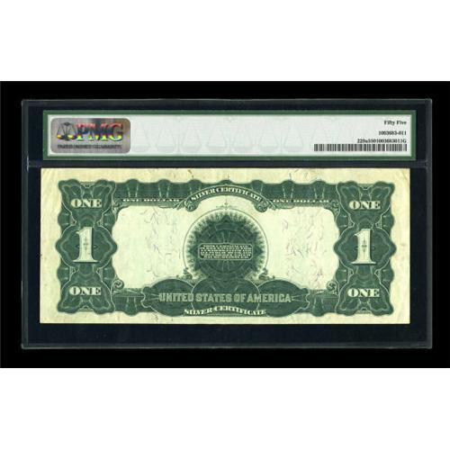 <B>Fr. 229a $1 1899 Silver Certificate PMG About Uncirculated 55.</B></I> A few corner folds and some light handling account for the grade on this attractive 229a. The body of the note is free of folds, giving it a wonderful overall appearance. Some embossing of the seal is visible in the open portion of the back design.<BR><BR><b>Shipping:</b> Coins & Currency (<a target="_blank" href="http://www.heritageauctions.com/common/shipping.php">view shipping information</a>)