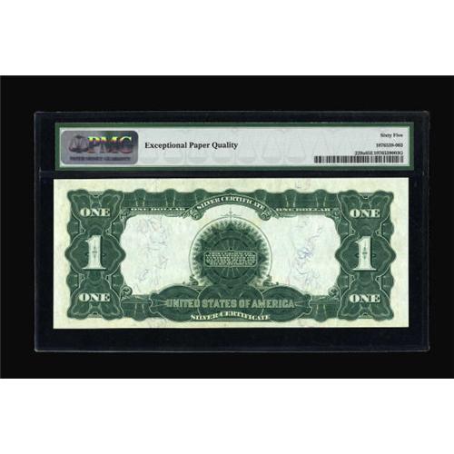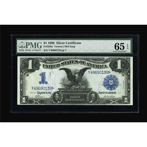 <B>Fr. 229a $1 1899 Silver Certificate PMG Gem Uncirculated 65 EPQ.</B></I> The rarest of the Black Eagles in a seldom seen grade. A little over 100 examples are known for this Vernon/McClung Date Right issue with not many as colorful or original as this one. The last few notes of this caliber realized over $20,000 at auction over two years ago. Simply stunning surfaces and deep inks should easily propel this note past that figure, given the demand for quality and rarity in the large-size collecting arena.<BR><BR><b>Shipping:</b> Coins & Currency (<a target="_blank" href="http://www.heritageauctions.com/common/shipping.php">view shipping information</a>)