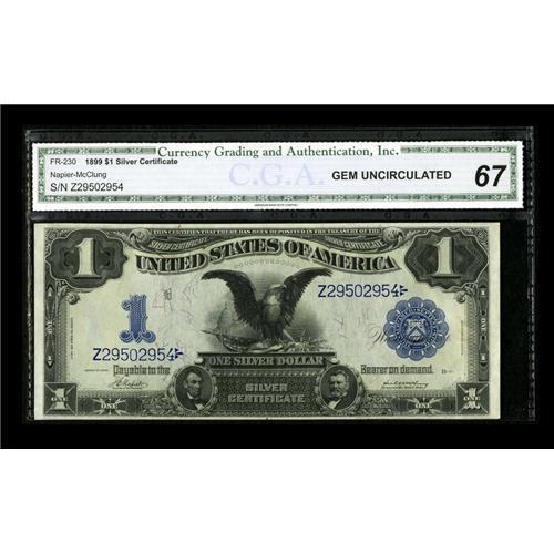 <B>Fr. 230 $1 1899 Silver Certificate CGA Gem Uncirculated 67.</B></I> The perfectly original paper waves are unhindered by the hint of handling at right.<BR><BR><b>Shipping:</b> Coins & Currency (<a target="_blank" href="http://www.heritageauctions.com/common/shipping.php">view shipping information</a>)