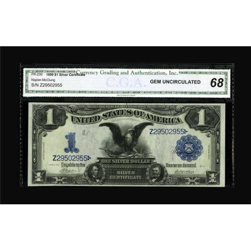 <B>Fr. 230 $1 1899 Silver Certificate CGA Gem Uncirculated 68.</B></I> Solid margins, bold embossing and pleasing paper waves are noted on this Napier-McClung Black Eagle.<BR><BR><b>Shipping:</b> Coins & Currency (<a target="_blank" href="http://www.heritageauctions.com/common/shipping.php">view shipping information</a>)