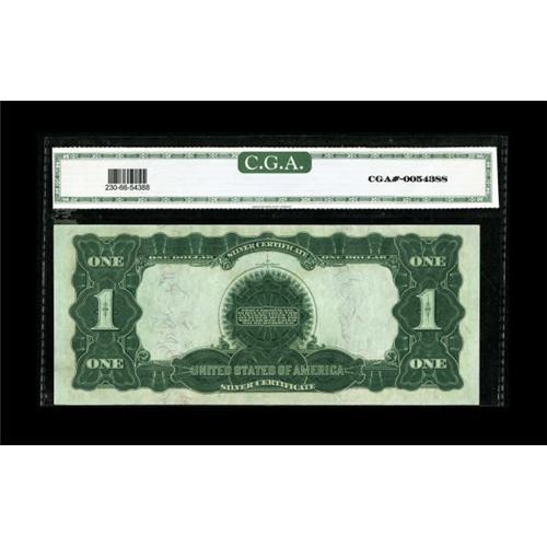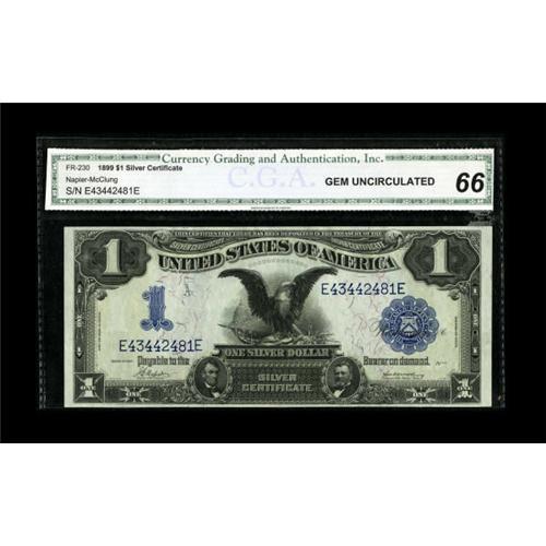 <B>Fr. 230 $1 1899 Silver Certificate CGA Gem Uncirculated 66.</B></I> The embossing of the serial numbers remains bold and is easily visible in the holder.<BR><BR><b>Shipping:</b> Coins & Currency (<a target="_blank" href="http://www.heritageauctions.com/common/shipping.php">view shipping information</a>)