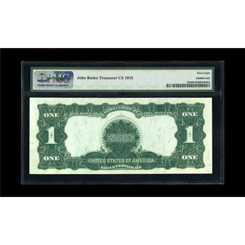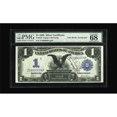 <B>Fr. 230 $1 1899 Silver Certificate Courtesy Autograph PMG Superb Gem Unc 68.</B></I> John Burke was gracious enough to sign this note in 1913. Gigantic margins frame out this Black Eagle nicely.