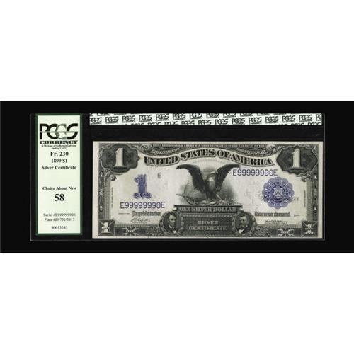 <B>Fr. 230 $1 1899 Silver Certificate PCGS Choice About New 58.</B></I> Nine digits away from solid nines. Nicely embossed with a slight paper scuff at upper right.