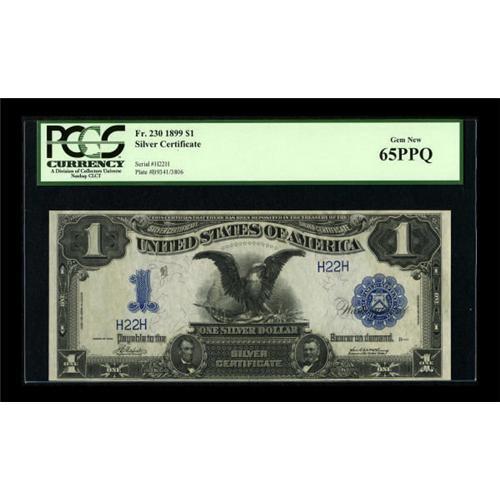 <B>Fr. 230 $1 1899 Silver Certificate Serial Number H22H. PCGS Gem New 65PPQ.</B></I> This gorgeous Black Eagle displays a true radar of H22H. Well margined with plenty of embossing present.<BR><BR><b>Shipping:</b> Coins & Currency (<a target="_blank" href="http://www.heritageauctions.com/common/shipping.php">view shipping information</a>)