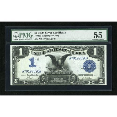 <B>Fr. 230 $1 1899 Silver Certificate PMG About Uncirculated 55.</B></I> This well margined note exhibits deep inks.<BR><BR><b>Shipping:</b> Coins & Currency (<a target="_blank" href="http://www.heritageauctions.com/common/shipping.php">view shipping information</a>)