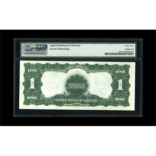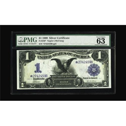 <B>Fr. 230 $1 1899 Silver Certificate Star Note PMG Choice Uncirculated 63.</B></I> From our Fun 2002 sale where it was described, "This is a near-Gem example of a popular Star Note type. It's strictly original, well margined, and quite bright. Only 25 star notes of this number are recorded in the last Murray census." Now there are a little over 40 notes known.
