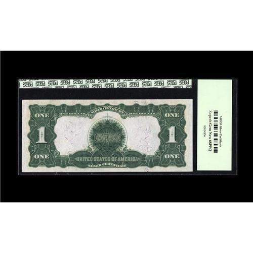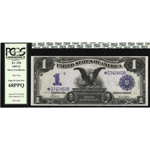 <B>Fr. 230 $1 1899 Silver Certificate Star Note PCGS Superb Gem New 68PPQ.</B></I> An absolutely great Star that earned its PPQ modifier with its embossing, natural paper ripple, and full margins. Add in the blue overprint laying on white paper and you have one quality Black Eagle. Very few Black Eagle Stars can rival this eye-appealing beauty.