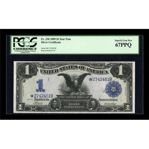 <B>Fr. 230 $1 1899 Silver Certificate Star Note PCGS Superb Gem New 67PPQ.</B></I> This fully embossed, totally original Black Eagle Star with wide margins for the type comes from a run of CU examples as listed in the Murray census. It is the sheetmate of the example graded 68PPQ that is offered above and very nearly as nice. It will be quite some time before a consecutive pair of this caliber appear together again. We sold this piece in January of 2007, when it realized $17,250, a number it should certainly reach again this evening.<BR><BR><b>Shipping:</b> Coins & Currency (<a target="_blank" href="http://www.heritageauctions.com/common/shipping.php">view shipping information</a>)