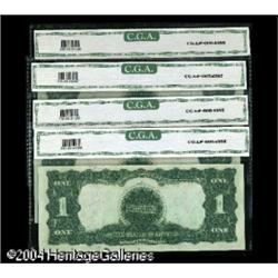 Fr. 230 $1 1899 Silver Certificates Cut Sheet of Four C <B>Fr. 230 $1 1899 Silver Certificates Cut Sheet of Four CGA Gem Uncirculated 66.</B></I> This pretty cut sheet possesses vivid blue and black inks that contrast nicely with the bright white paper surfaces. The four notes all have broad margins and appear through the encapsulated holders to have fully earned their "66" grade. 4 notes <BR><BR><B>Important notice:</B> Heritage usually auctions material at the rate of 200-250 lots per hour. On some occasions eBay Live bid software or the Internet may not be able to keep up with the pace of the auction. We recommend placing a realistic absentee bid now as insurance to avoid disappointment. Occasionally the auctioneer may eliminate or reject an eBay Live bid, and the auctioneer may also reopen a lot after the close of the eBay live bidding (usually because we missed an audience bid), and may reject your bid even if it shows you as the winning bidder. By bidding via eBay Live, you agree that Heritage may award the lot to another bidder at its sole discretion under the circumstances described above or any other reasonable circumstances. Since eBay bids are not shown to us until we open the lot on the floor, we treat those bids just like floor bids. In most cases the floor responds before the eBay bid is presented to us, due to Internet lag time, so for consistency we have made it a policy that floor bids are always considered first over tie eBay live bids. Also please note that all Heritage lots purchased through eBay Live carry a 20% Buyer's Premium. Please make sure you read the Terms and Conditions before you bid. This lot is being auctioned in conjunction with a live floor auction by Heritage Galleries & Auctioneers. All final auction and invoice information will be supplied by Heritage Galleries & Auctioneers, and all other information should be considered preliminary. Lot:17147